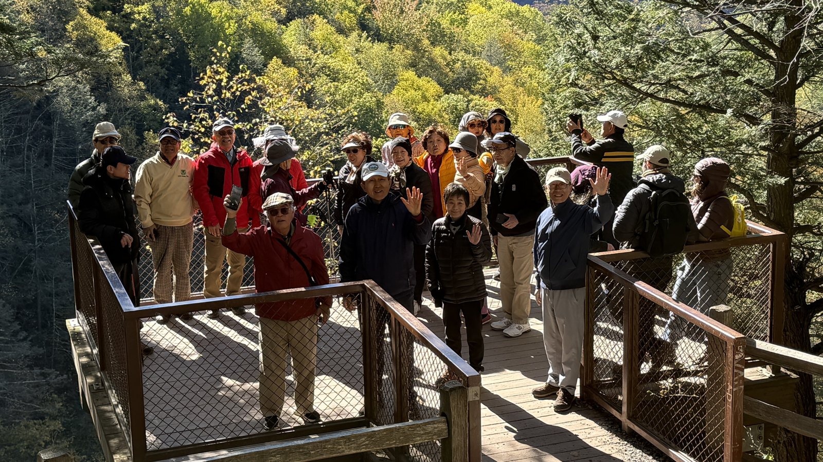 다음으로 이동한 Kaaterskill Falls 주변은 다행히 바람이 거의 불지 않아 일행은 편안하게 폭포를 감상할 수 있었습니다. 회원들은 경사가 완만한 산책로를 따라 폭포 위쪽 관람대로 이동하여, 2단으로 힘차게 쏟아져 내리는 물줄기와 주변의 아름다운 단풍이 어우러진 장관을 배경으로 기념사진을 찍었습니다. 특히 몇몇 회원들은 용기를 내어 폭포 하단으로 이어진 급한 경사의 계단을 따라 내려가, 내리꽂는 물줄기와 웅장한 물소리를 더욱 가까이에서 체험하고 돌아오기도 했습니다.